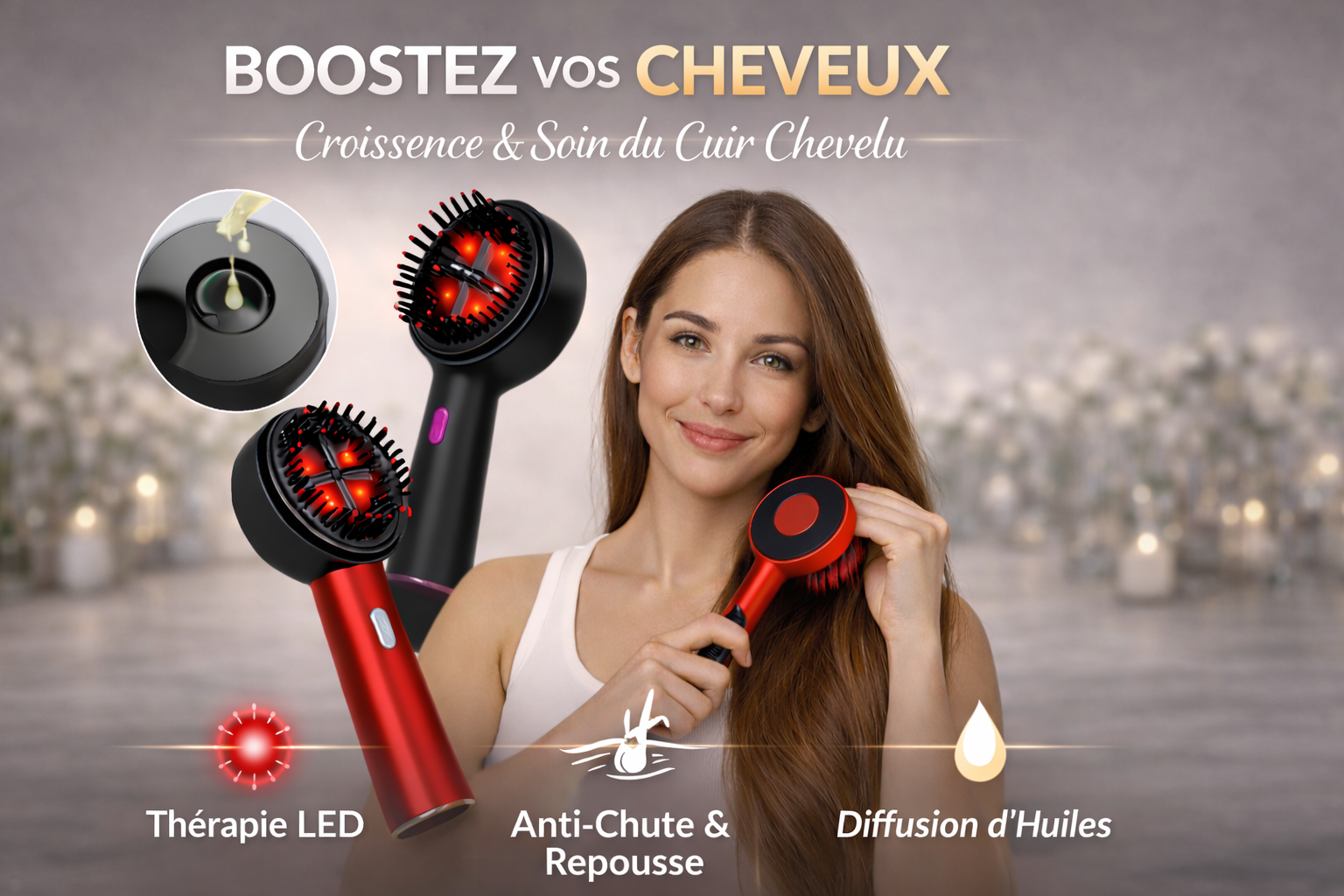 Équipé d’une lumière LED, de vibrations relaxantes et d’un applicateur d’huile intégré, il aide à stimuler la croissance, à réduire la chute des cheveux, à soulager les tensions du cuir chevelu et à nourrir les racines pour des cheveux visiblement plus épais et en meilleure santé.